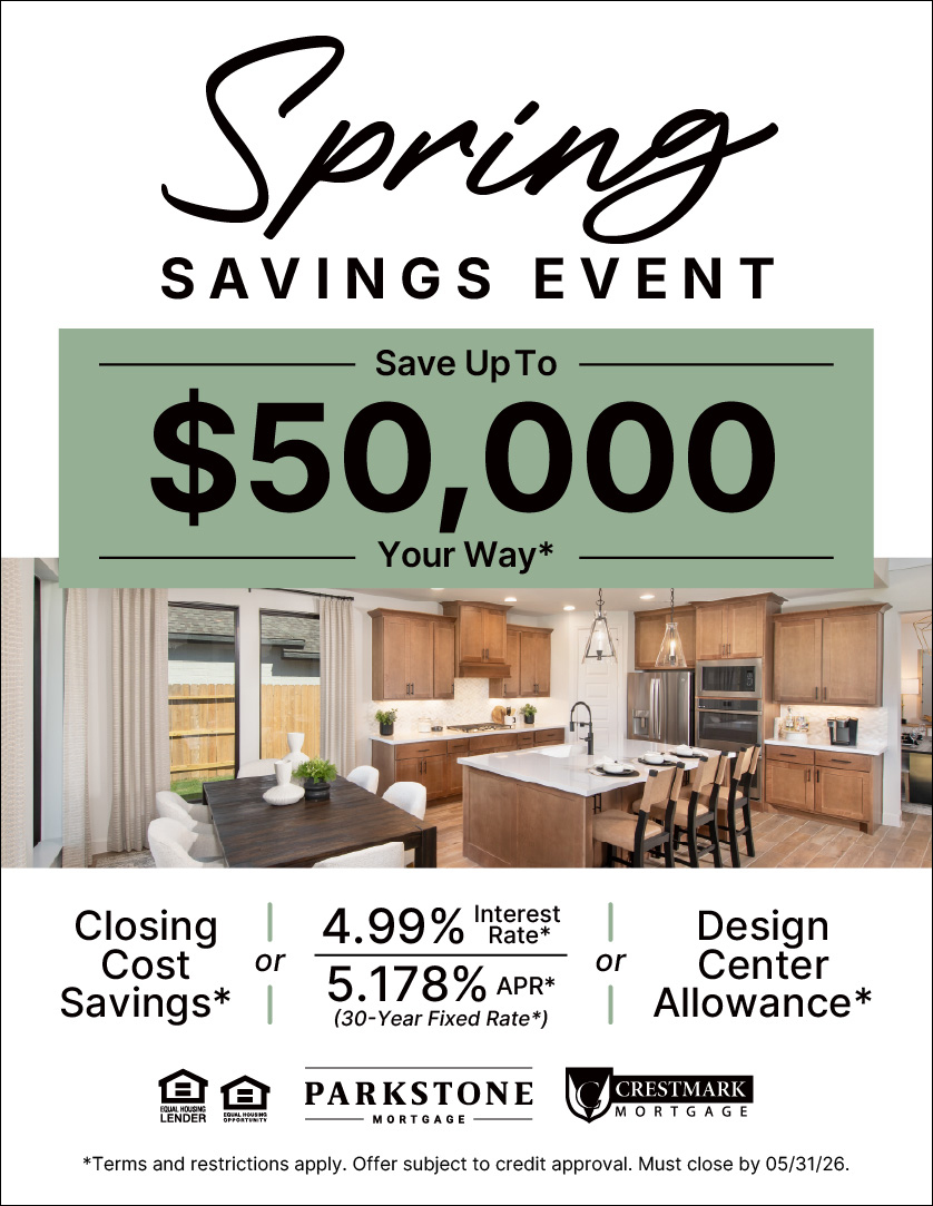 | *This offer may change or be terminated at any time without notice and is subject to terms and conditions. Purchase a select Perry Homes, LLC (“Perry Homes”) inventory or build residence in Austin or San Antonio and choose the following financial incentives paid for by Perry Homes: up to $50,000 in a low interest rate of 4.99% (5.178% APR), design center allowance, or closing costs. Required Disclosures: Total incentives will be given in the following forms: 1. Up to $50,000 in closing costs paid by Seller include pre-paid items and will be subject to and determined by federal regulations, the amount of the mortgage, type of mortgage loan selected by purchaser and other requirements. to a combined maximum of 6% of the contract sales price. 2. The $5,400 special incentive offered by Crestmark or Parkstone is included in the elected promotional incentive. Perry Homes is not a lender and does not offer financing. Mortgage financing under the offer is made available by Crestmark Mortgage Company, LTD (“Crestmark”) or Parkstone Mortgage, LLC (“Parkstone”). Not all borrowers will qualify for the offers. 3. Receive up to $50,000 in design center allowance paid by Perry Homes. The design center allowance may not be combined with other offers and is subject to certain qualifications and restrictions. Low Interest Rate • Loan Amount: Subject to credit and property approval. • Fees and Closing Costs: Other fees and closing costs may apply. • Low-Interest Rate Details: The 4.99% (5.178% APR) is obtained through an interest rate buydown by purchase of points. • For example: If a qualified Purchaser is buying an eligible $500,000 Perry Homes residence with a 10% down payment (loan amount of $450,000, estimated closing costs of $8,566, a FICO score of 760, and a 30-year fixed-rate conventional loan, the interest rate is 4.99% (5.178% APR). Monthly principal and interest would be $2,412.95, plus a monthly PMI of $75. The amounts do not include property taxes, hazard insurance, or HOA dues (if applicable), and the actual payment obligation will be greater. Rates listed are effective as of 03/03/2026, are for illustrative purposes only, and are subject to change. Rate is subject to Agency Loan Level Pricing Adjustments for credit score and Loan to Value (LTV); however, a customer’s credit pro‑le could lead to a higher interest rate. • Rates and Terms: Rates are subject to change and may vary based on credit qualifications and market conditions. • APR Calculation: The APR is based on the actual note interest rate and assumes a $500,000 loan amount with a 30-year fixed term. Actual APR may vary based on the borrower’s loan amount, down payment, specific loan terms, and creditworthiness. • The interest rate advertised includes an interest rate buydown offer through purchase points paid by Perry Homes that is subject to qualifications, and restrictions apply to all offers. • The amount that Perry Homes can pay for an interest rate buydown will be subject to and determined by federal regulations, the amount of the mortgage, type of the mortgage loan selected by Purchaser and other requirements that apply to maximum seller contribution limitations, which may vary based on type of loan selected by Purchaser. • Limited-Time Offer: This is a promotional offer and may be subject to expiration or withdrawal at any time without notice. • Not all borrowers will qualify for the promotional rate, and it is only available to homes purchased as borrower's principal residence. Actual interest rates are set by your lender. Please contact your lender for information about actual loan terms that may be available to you. Up to $50,000 in total incentives will be given in the following forms 1. Closing costs paid by Perry Homes include pre-paid items and will be subject to and determined by federal regulations, the amount of the mortgage, type of mortgage loan selected by purchaser and other requirements to a combined maximum of 6% of the contract sales price. Lower sales prices may not receive the full $50,000. 2. The $5,400 special incentive offered by Crestmark/Parkstone is included in the elected promotional incentive. 3. Any amount that Perry Homes can pay for closing costs or an interest rate buydown will be subject to and determined by federal regulations, the amount of the mortgage, type of mortgage loan selected by Purchaser and other requirements that apply to maximum seller contribution limitations, which may vary based on type of loan selected by Purchaser. Qualification Requirements: To qualify, purchaser must: 1. Select, qualify with, and use Crestmark Mortgage Company, LTD (NMLS #287961) or Parkstone Mortgage, LLC (NMLS #2065952) to provide financing. 2. Choose a build home designated for this offer. 3. Present this offer flyer upon an initial visit to a Perry Homes Model Home 4. Home must close by 6/31/2026 Additional requirements may apply. Contact your lender for full eligibility information and actual loan terms that may be available to you. Important Lender Relationship Disclosures: • Crestmark and Parkstone are affiliates of Perry Homes. • You are NOT required to use Crestmark or Parkstone as a condition to purchase your property. • However, using Crestmark or Parkstone IS required to qualify for this Perry Homes promotional offer. Licensed Lender Information: Crestmark Mortgage Company, LTD TX SML Mortgage Banker Registration NMLS #287961 Austin: 310 W University Avenue, Unit 2, Georgetown, TX 78626, (281) 301-2389 San Antonio: 3239 N Loop 1604 W, Suite 220, San Antonio, TX 78257, (210) 979-9595 https://www.houseloan.com/crestmarkmortgage/ Parkstone Mortgage, LLC TX SML Mortgage Banker Registration NMLS #2065952 Houston: 6002 Rogerdale Road, Suite 530, Houston, TX 77072, (832) 493-3075 https://www.parkstonemortgage.com/index.htmlome For Texas residents: To file a complaint about a mortgage company, mortgage banker, or licensed mortgage loan originator, please v